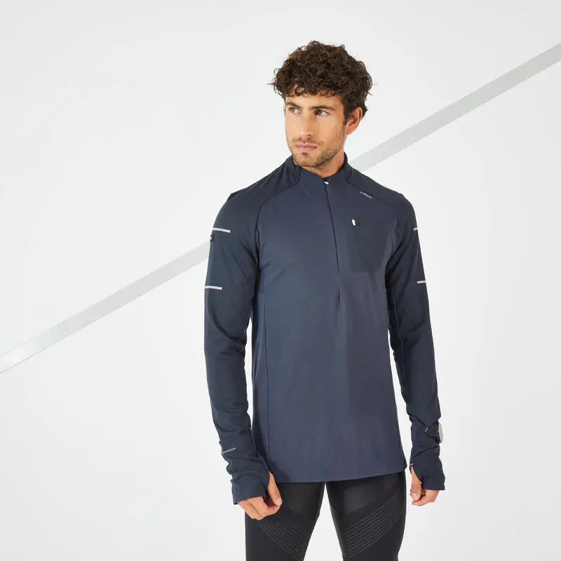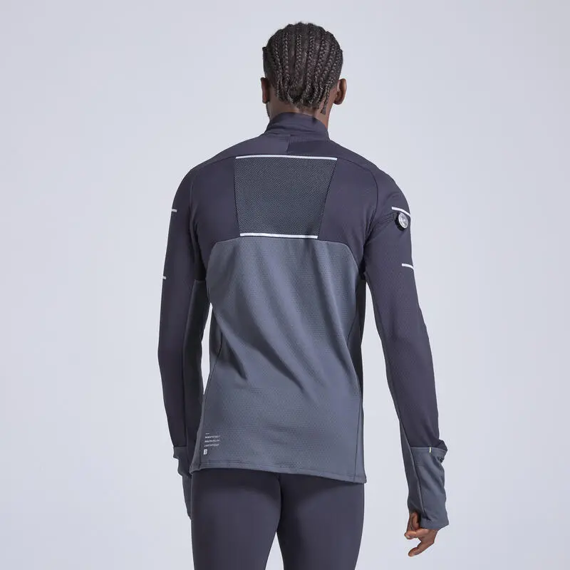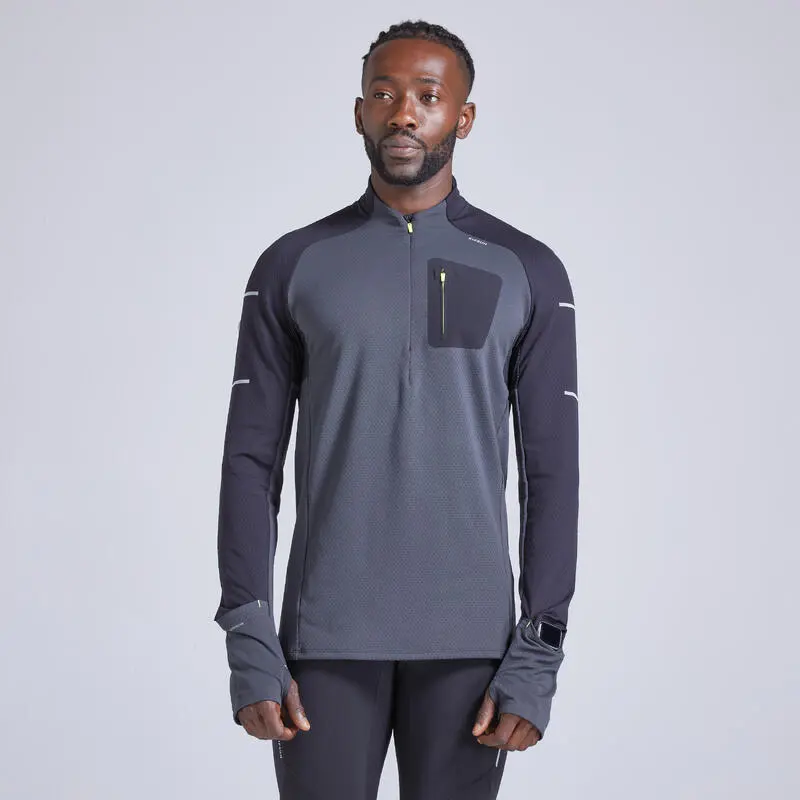Compra en Decathlon Camiseta running manga larga Hombre Kiprun Warm Camiseta de manga larga de running para hombre, cálida y transpirable, para correr con tiempo frío. Bolsillo con cremallera en el pecho.